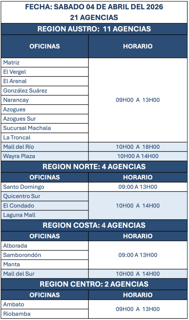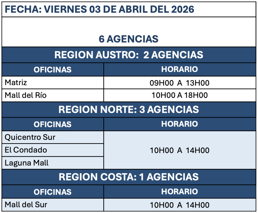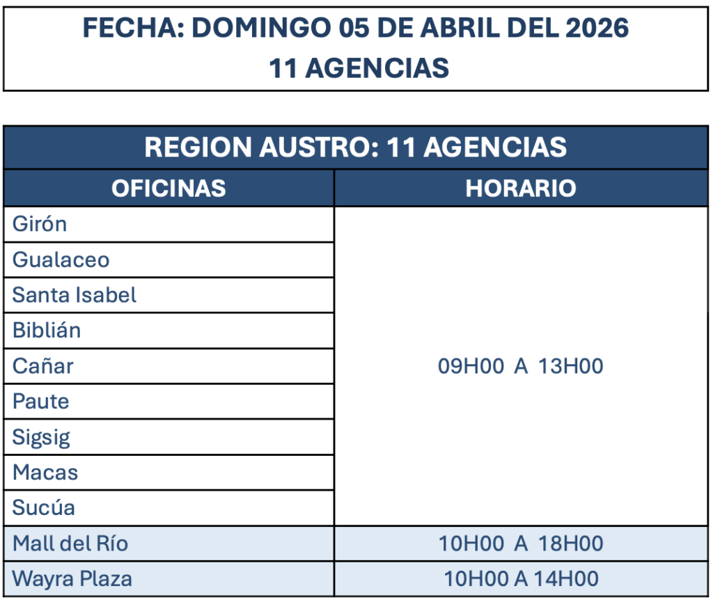 Las agencias y horarios en los que se atenderán el fin de semana son los siguientes: