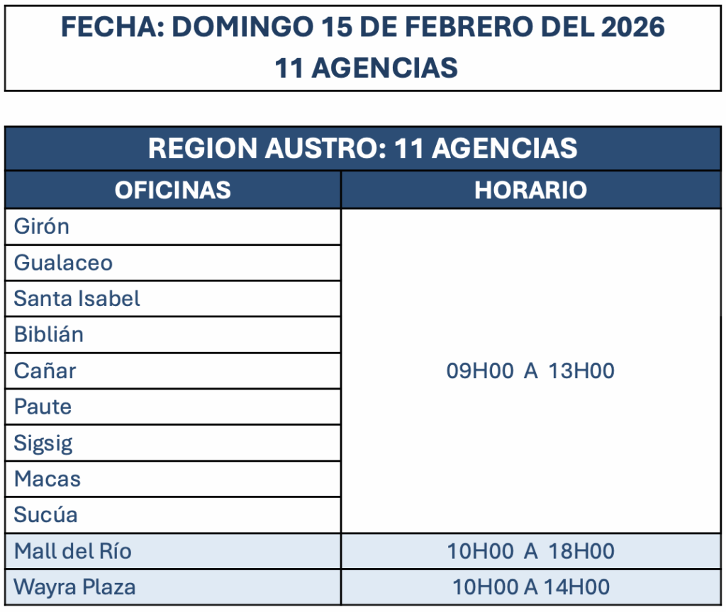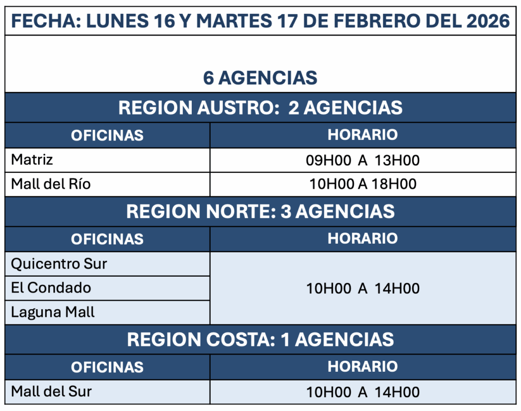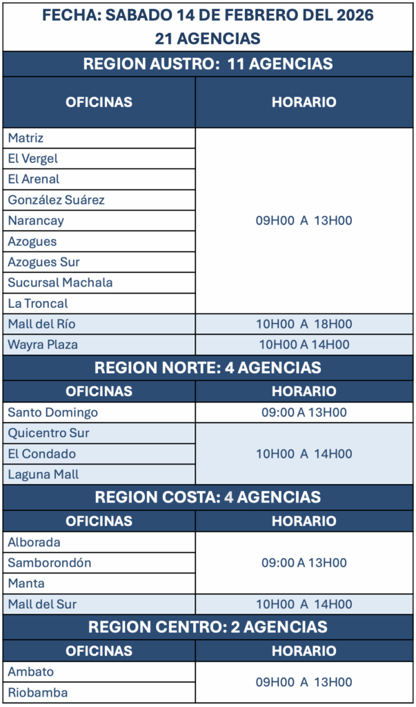 Las agencias y horarios en los que se atenderán el fin de semana y feriado son los siguientes: